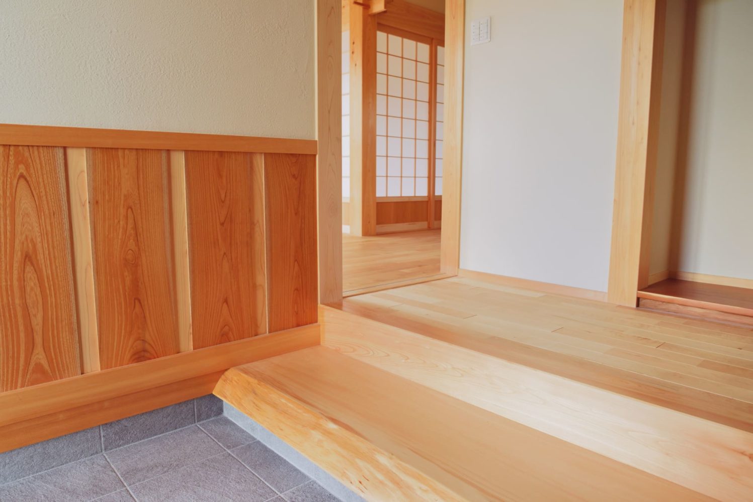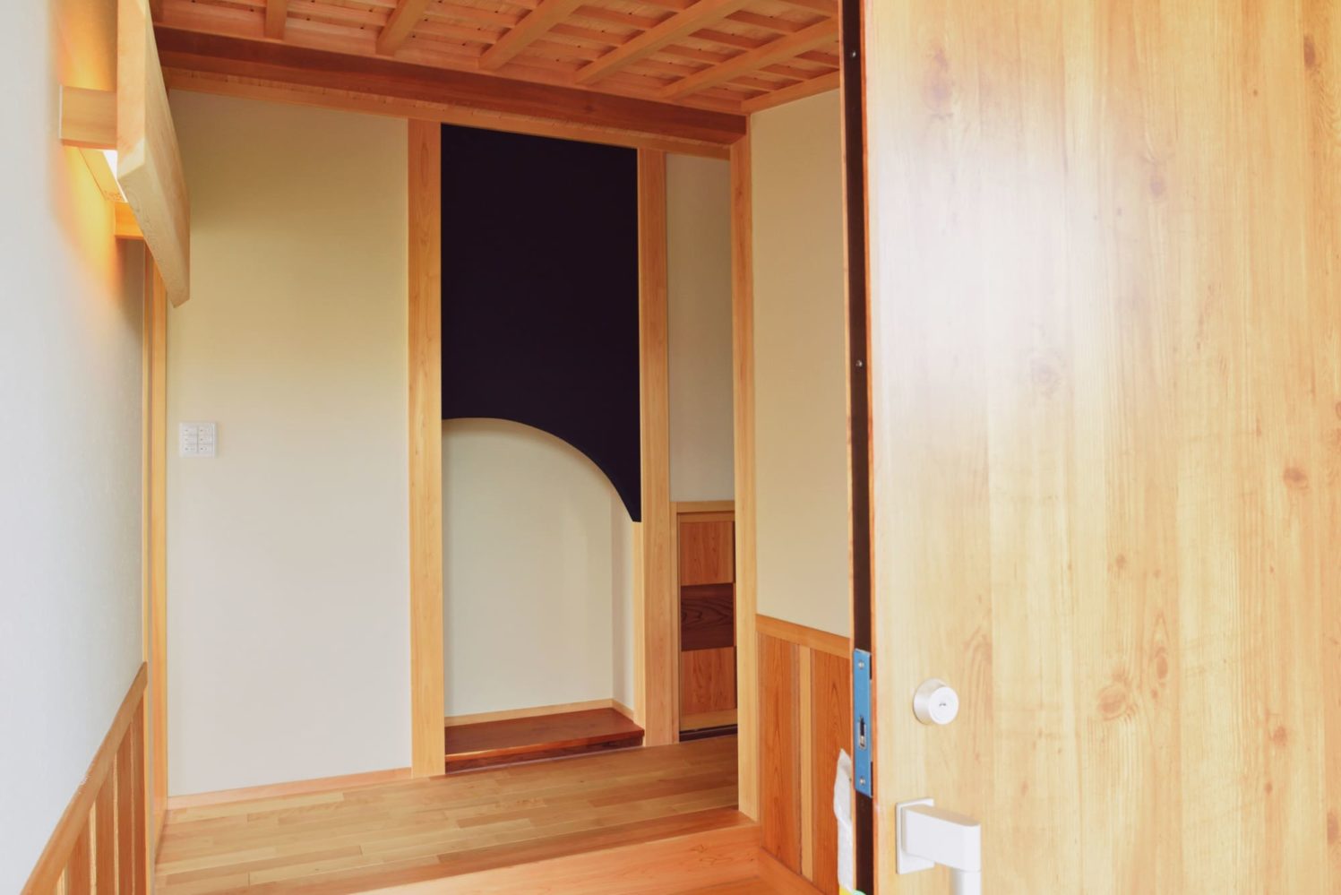 この家の顔となる玄関は、一歩足を踏み入れた瞬間から、杢工舎の美意識と職人技を感じられる特別な空間です。