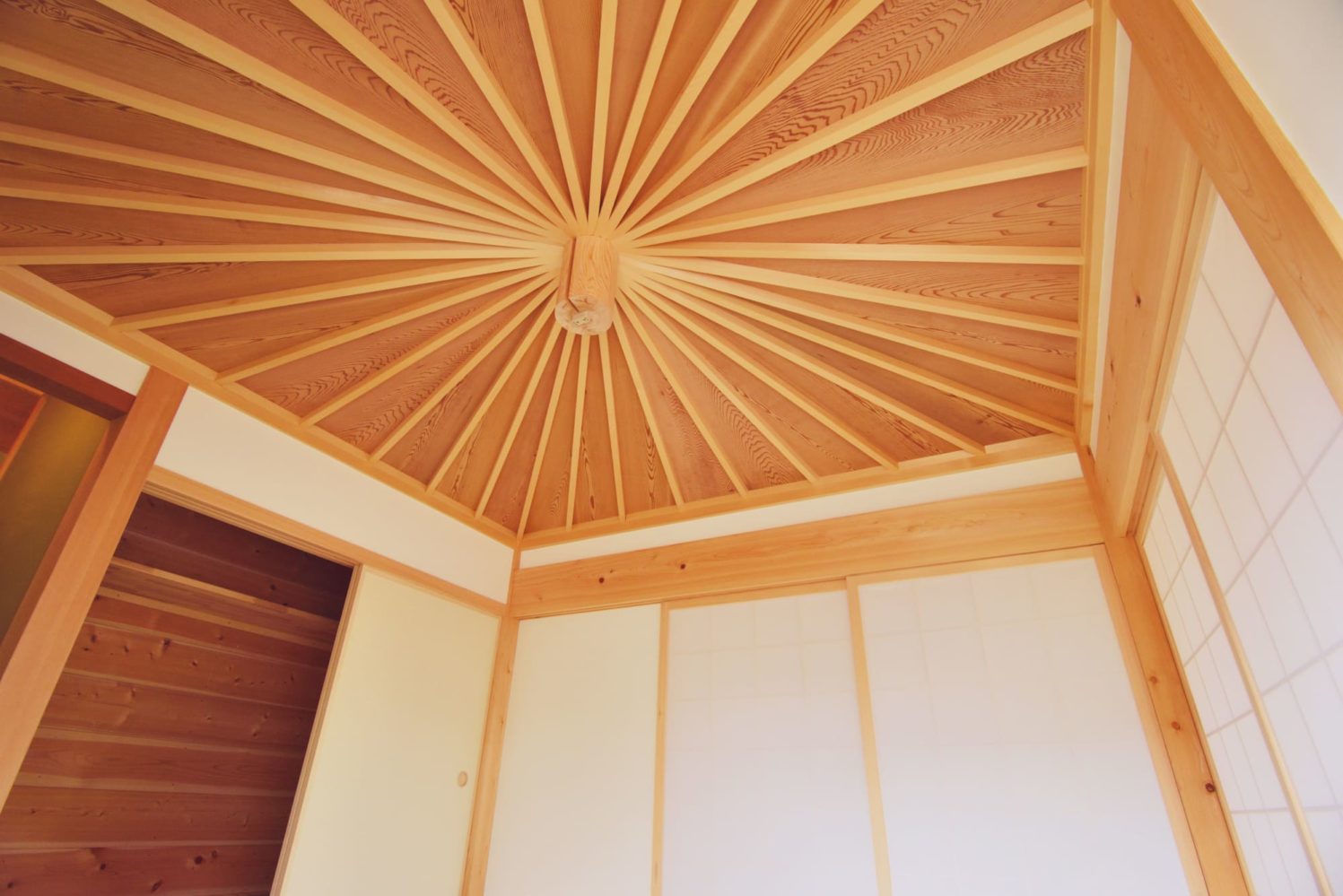 中央の一点から放射状に広がる垂木は、まさに職人技の結晶。