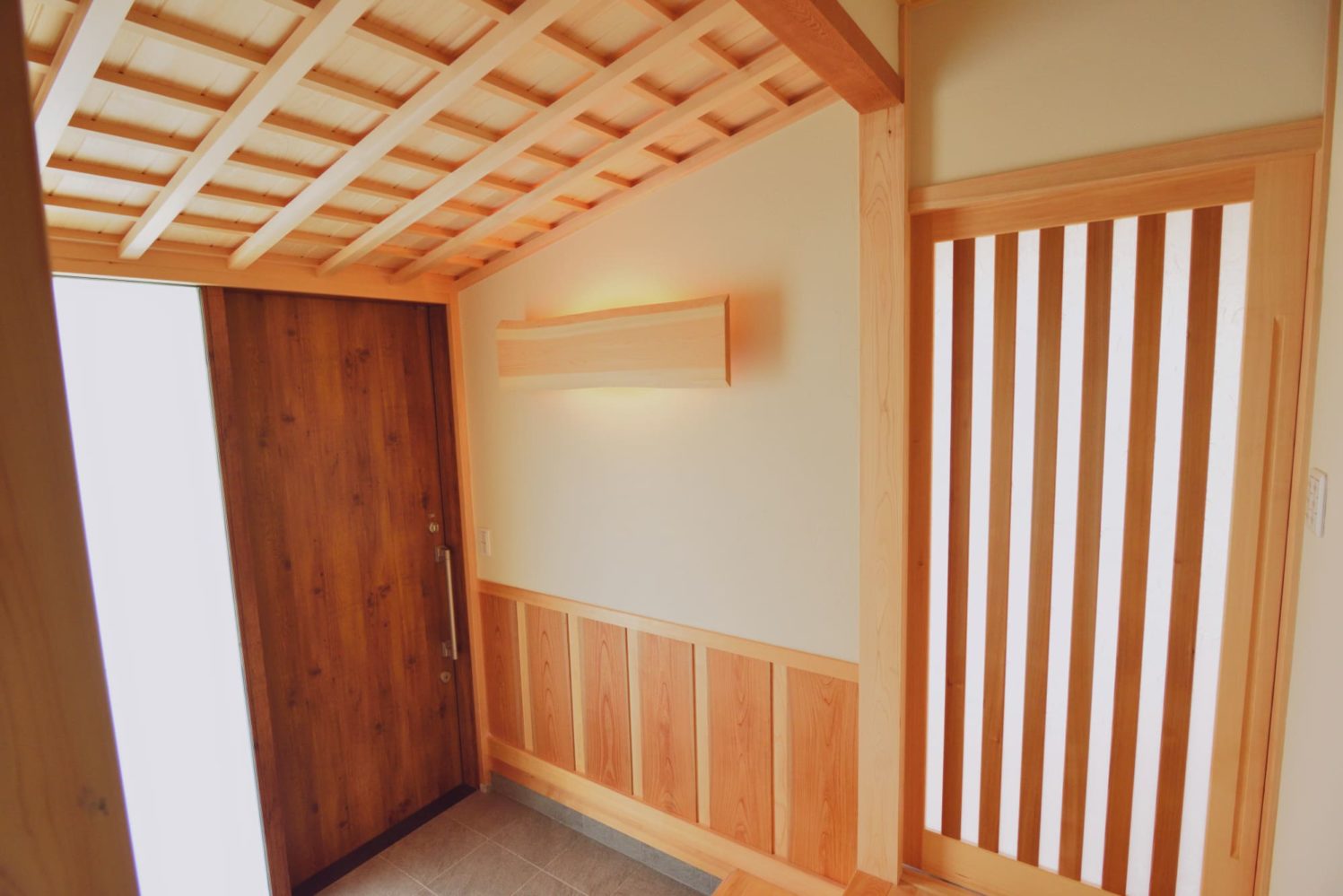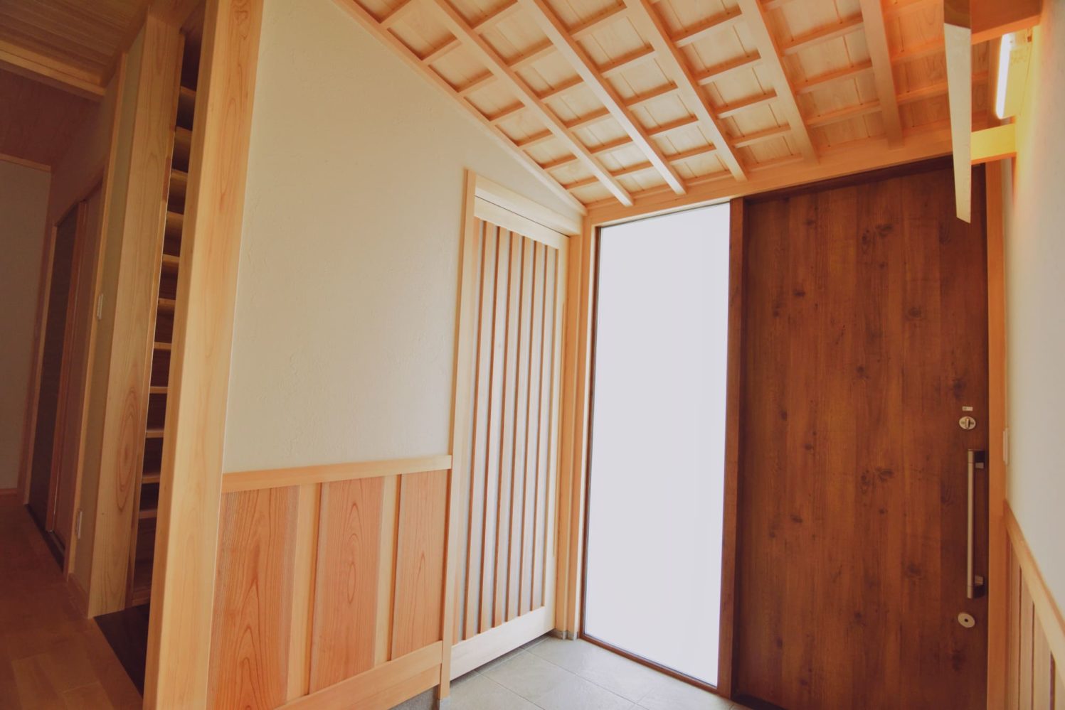 【玄関】我が家の顔は、木の芸術。訪れる人を優しく迎える、誇りの玄関。