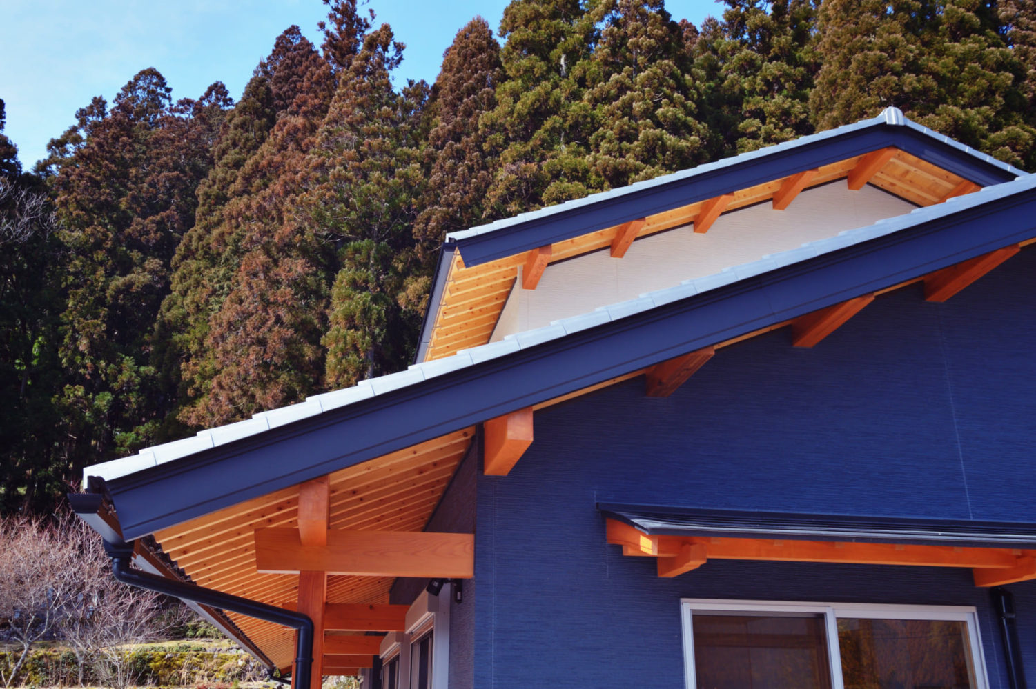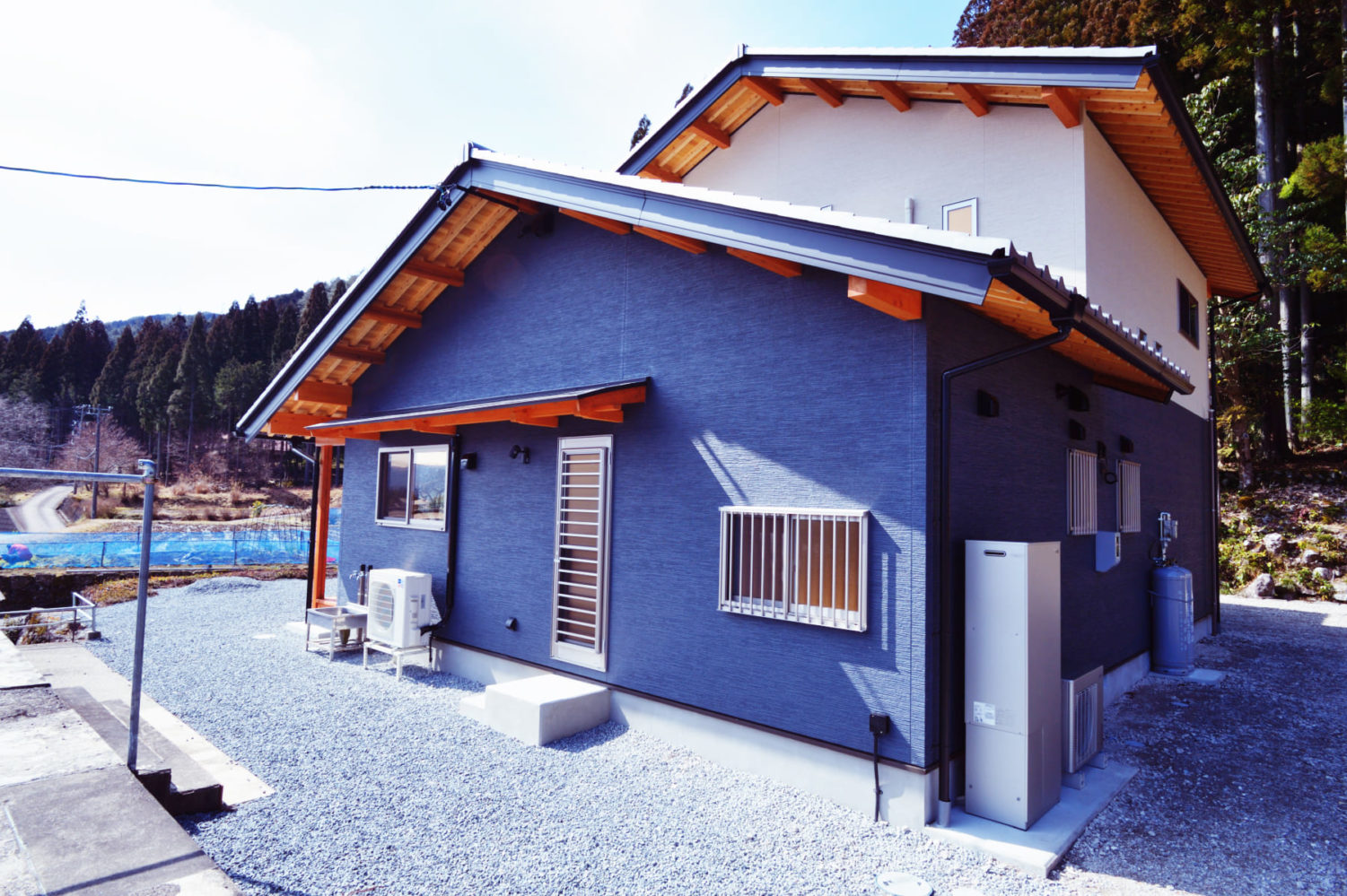 - 【外観】 空の青、森の緑、そして家の藍。飛騨の自然と響きあう、鮮烈な佇まい。