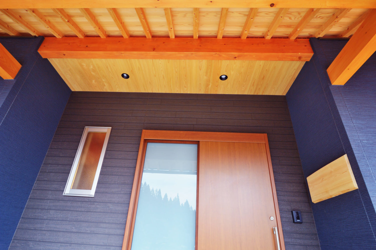 深い藍色と木の橙色が織りなすコントラストが、飛騨の豊かな自然の中で鮮烈な印象を放ちます。