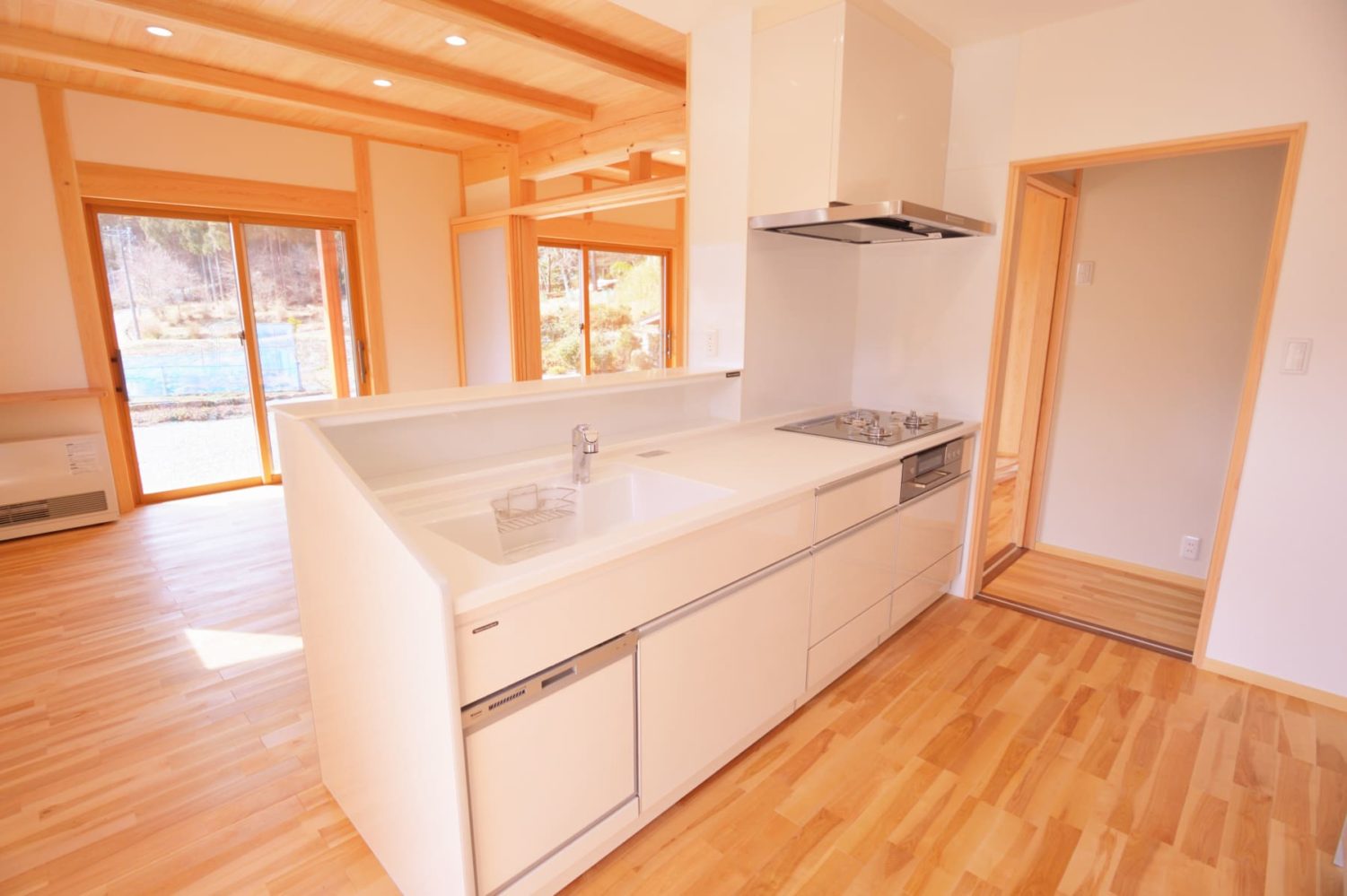 木の温もりに満ちた空間の中で、このモダンなキッチンが美しいアクセントとなり、暮らし全体を洗練された印象に引き締めています。