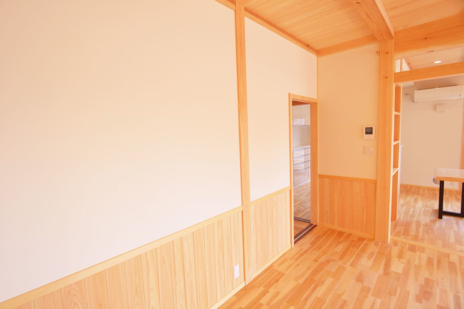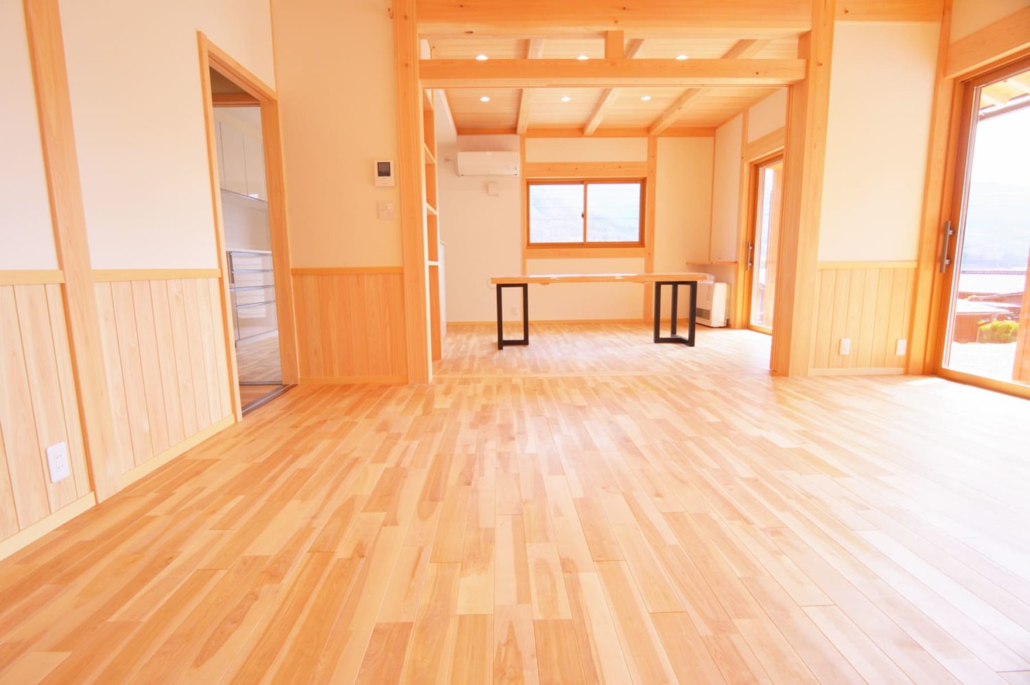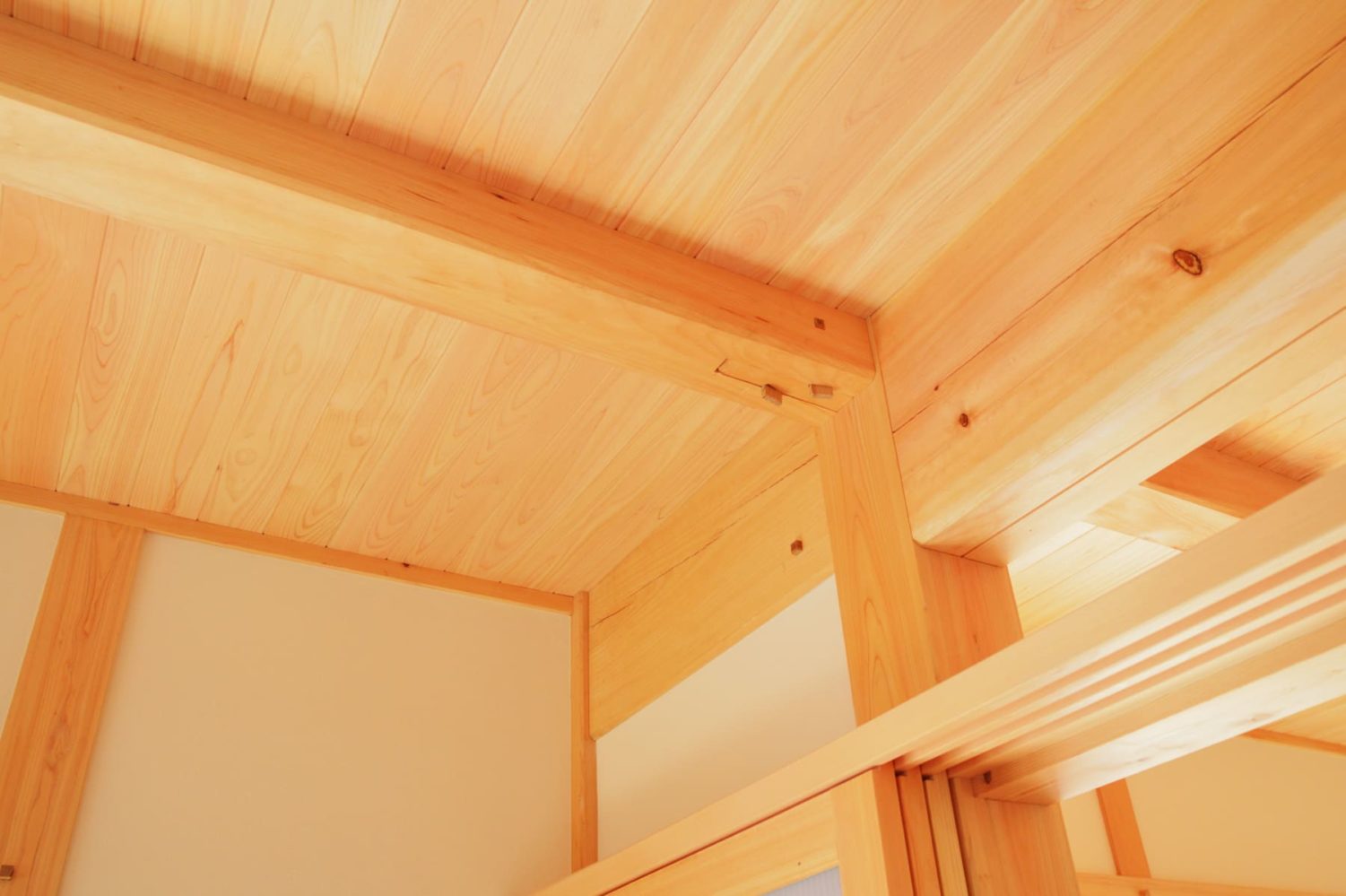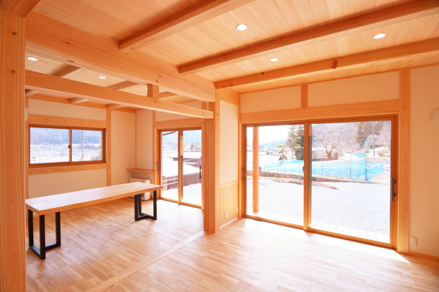 天井を見上げれば、杢工舎の真骨頂である「木造軸組工法」 ならではの、力強く美しい梁がダイナミックに架かっています。