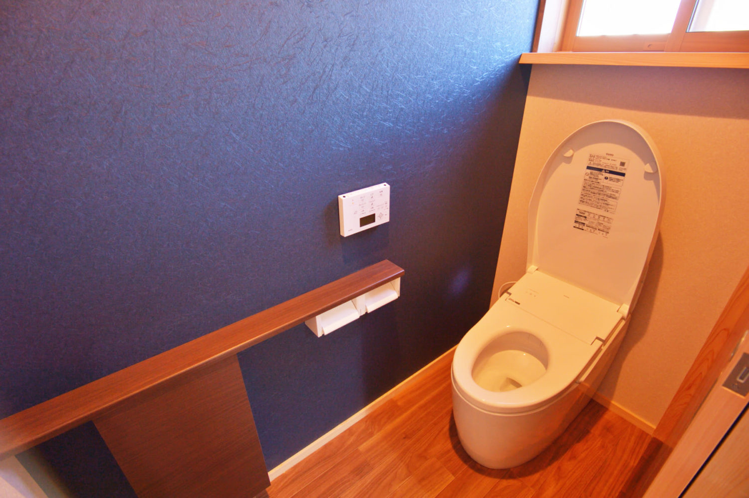 外壁や洋室のアクセントウォールと合わせた、落ち着いたネイビーの壁紙が印象的なトイレ。