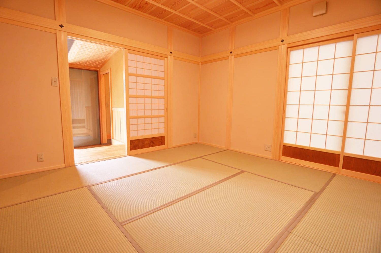 障子を通して届く柔らかな光が、畳と木の香りに満ちたこの部屋を、極上の安らぎ空間へと誘います。