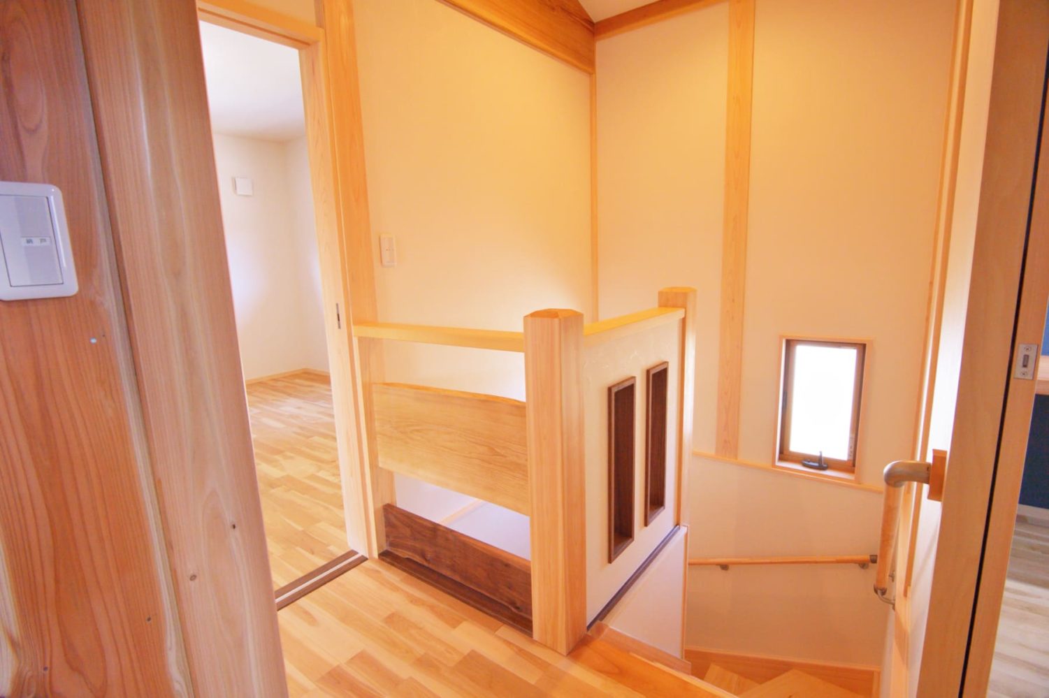 壁に設けられたスリット状の小窓から光が差し込み、階段を上り下りする時間さえも楽しいひとときに変えてくれる、遊び心あふれる設計です。