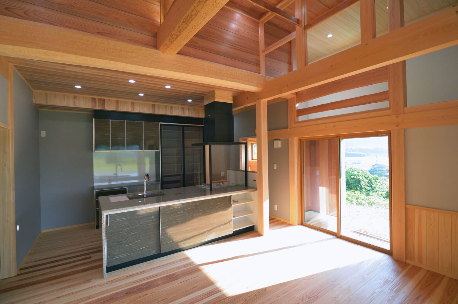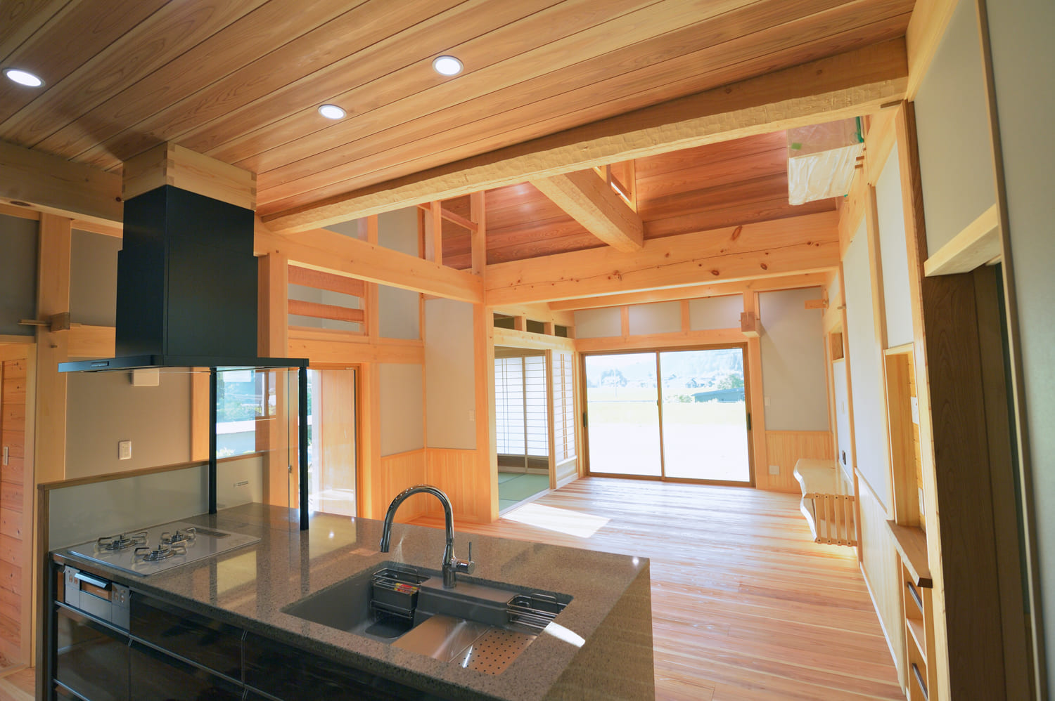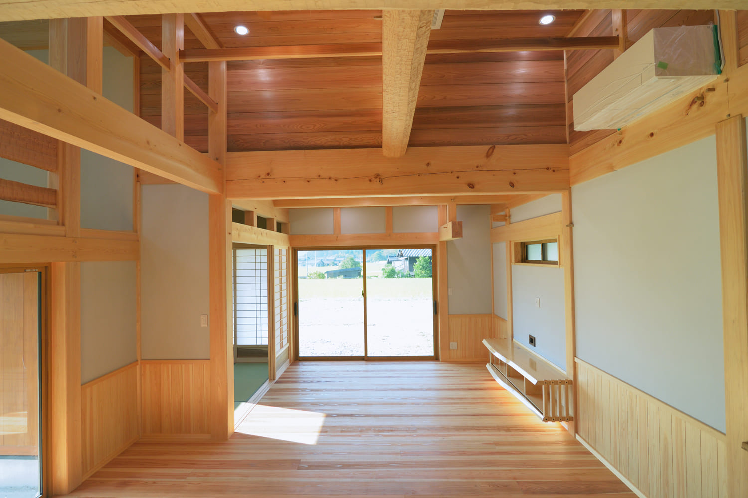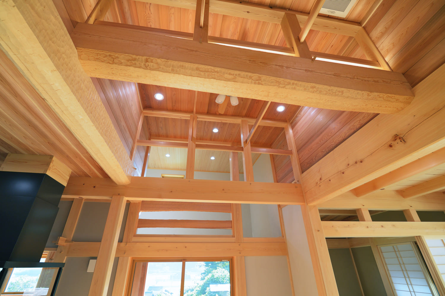 杢工舎の真骨頂である「木造軸組工法」ならではの、力強く巨大な「大梁(おおばり)」がダイナミックに架かっています。