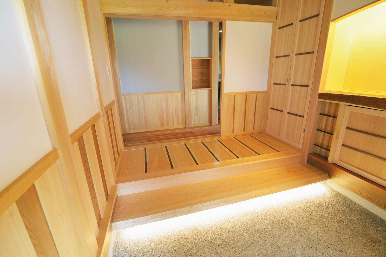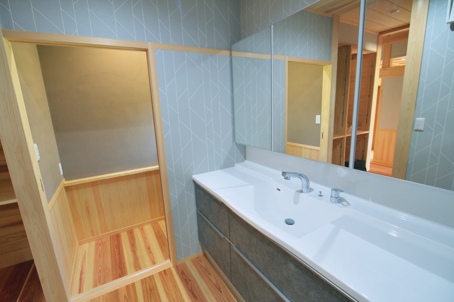 脱衣・洗濯・乾燥のスペースにも、杢工舎ならではの「木建具(きたてぐ)」の技が光ります。