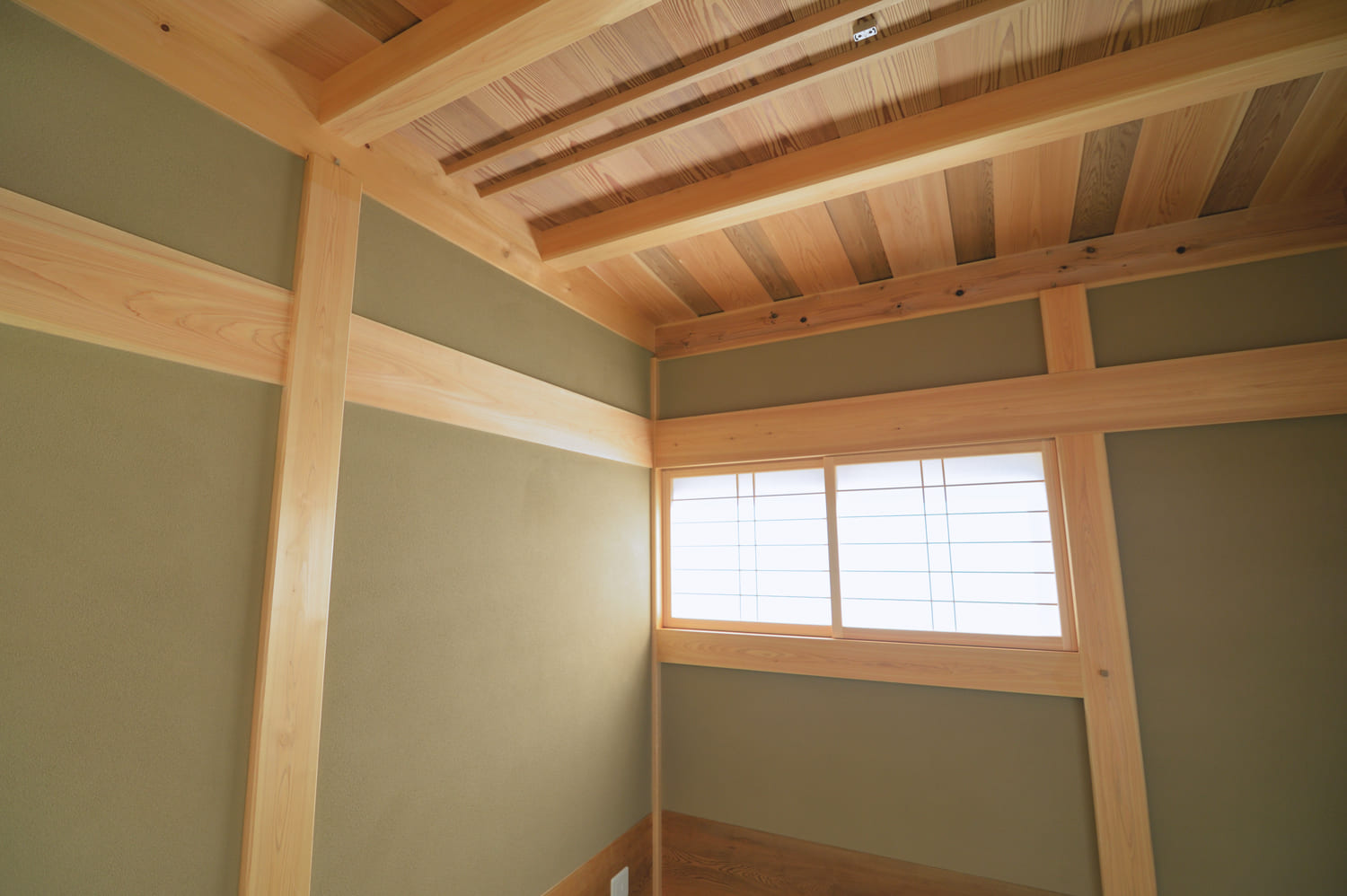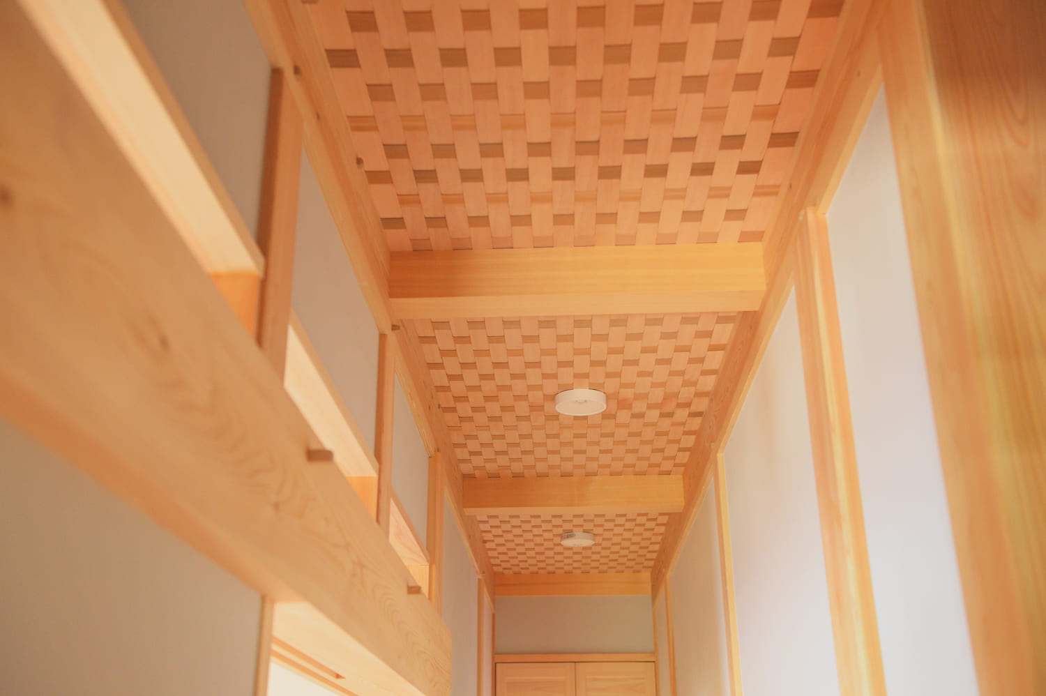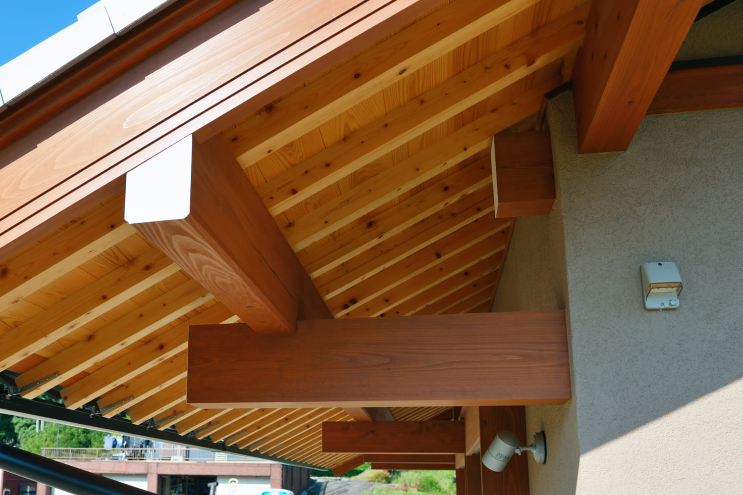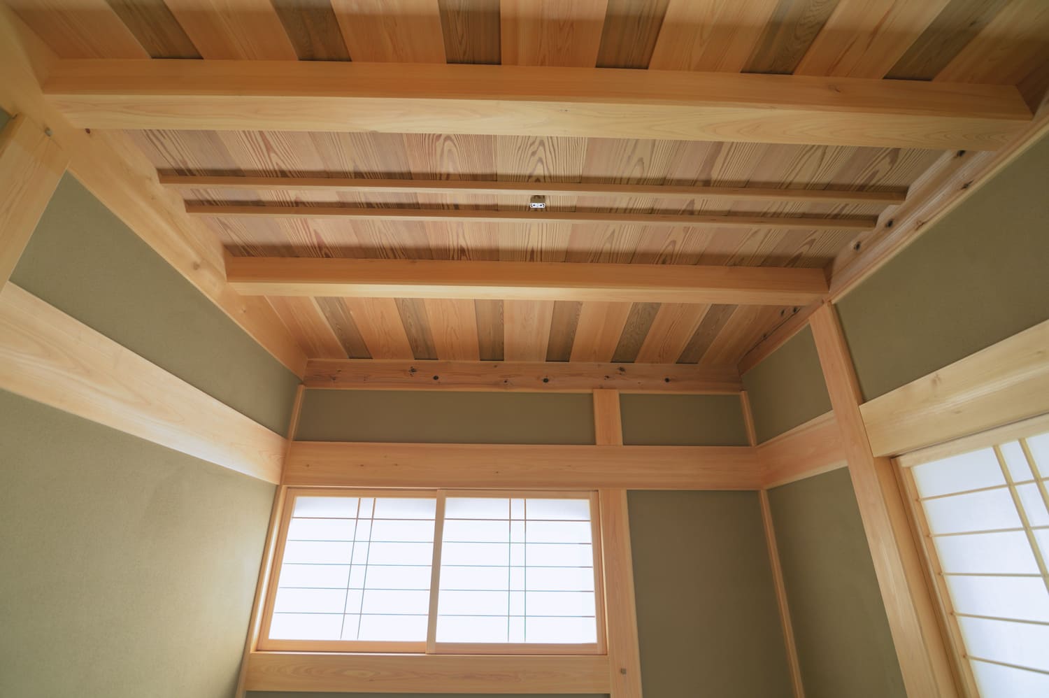 整然と並ぶ垂木(たるき)の一本一本が、この家を支える構造の力強さと、手仕事の緻密さを物語っています。