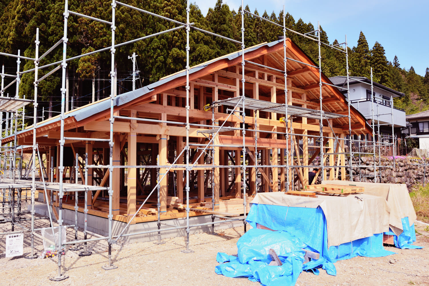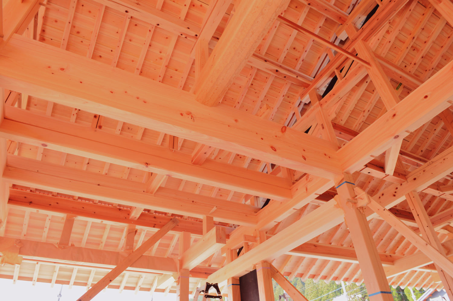 青空の下、力強く組み上げられていく「木造軸組」の骨格。